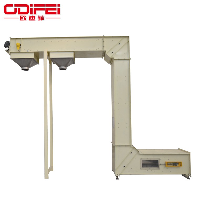 Елеватор типу Z- із нержавіючої сталі знаходиться в закритому корпусі й транспортує матеріали через бункер, підвішений на ланцюзі. Його можна передати горизонтально-вертикально-горизонтально. Це може бути одно-точкове або багато-точкове годування, а одно-точкове або багато-точкове розвантаження може бути завершено через розвантажувальний пристрій. Повністю закритий, без витоку, без забруднення. Найбільшою перевагою цього обладнання є те, що композиція є гнучкою, рівень пошкодження матеріалів низький, і генерація дефектних продуктів може бути усунена, і воно підходить для різних випадків, які потребують дбайливої обробки матеріалів. Такі як: зернові, пластмаси, гвинтові кришки для ріпаку тощо.